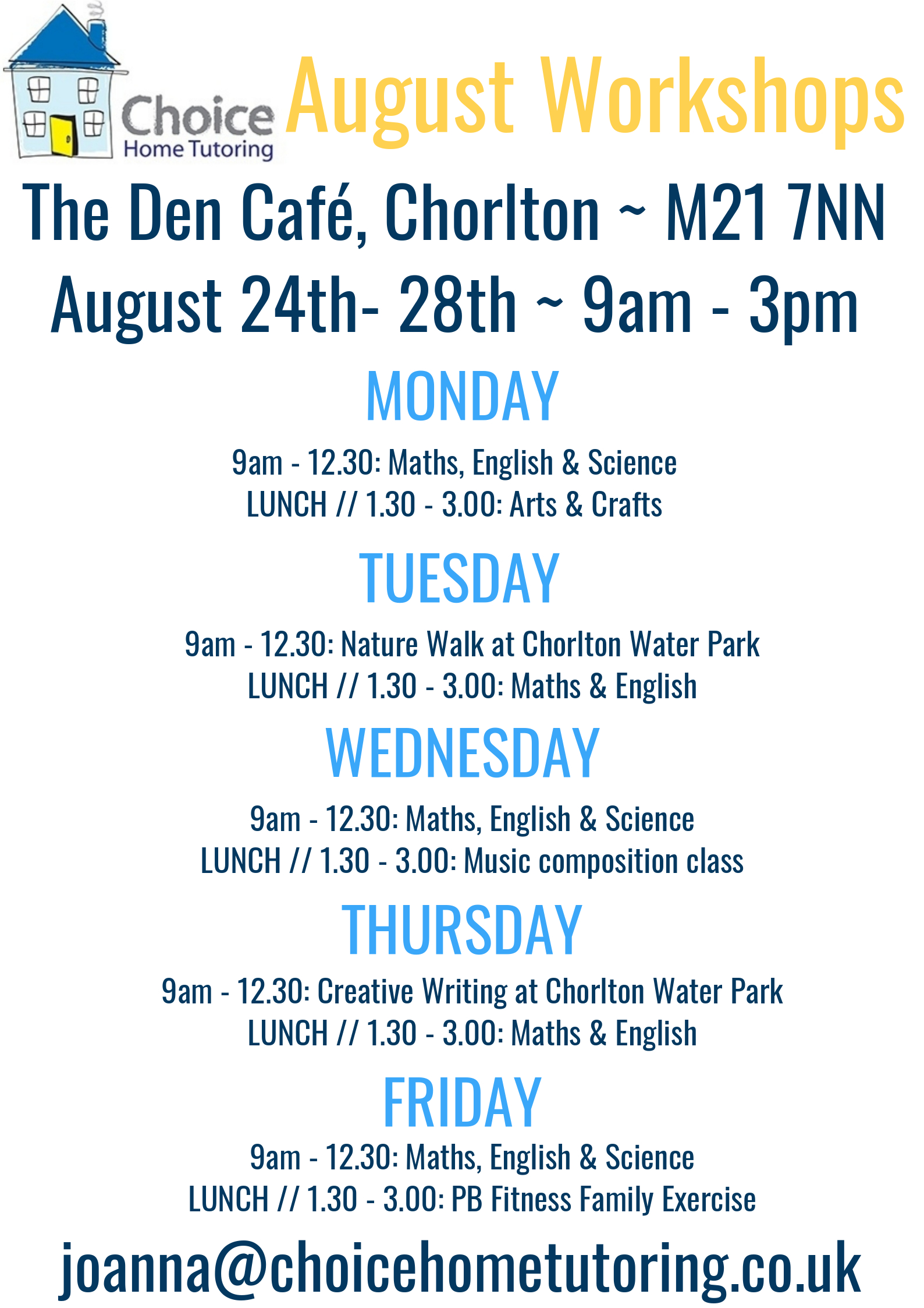 The cost of each day is £90 or £425 for the whole week. For more information or to book on to the course please get in touch at joanna@choicehometutoring.co.uk